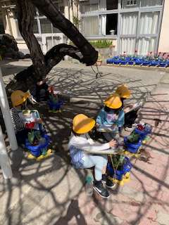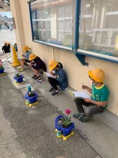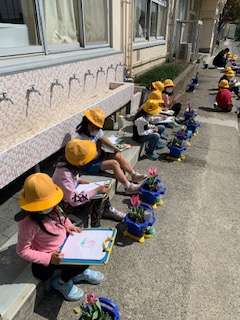 ポカポカ陽気の校庭で、1-2のみんながチューリップの観察をしていました。