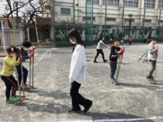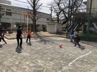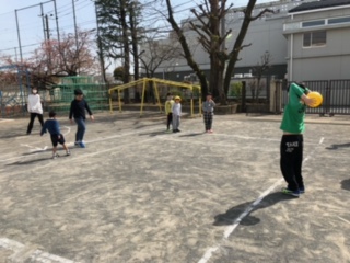 ドッジボールと、竹馬やバランスウォーカー、缶ポックリ、フリスビーなどで遊びましたヨ!!