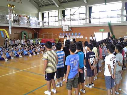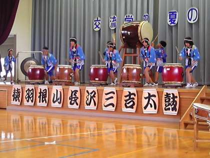 体育館で歓迎式が行われました。長沢小学校4・5・6年のみなさんの歓迎の三吉太鼓の演奏から始まりました。山崎太鼓誕生のもととなった力強い演奏に聞き入っていました。お互いに挨拶をし校歌を紹介し合いました。