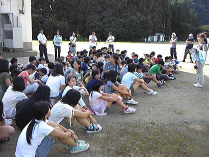 全体での記念写真撮影の後は、早速、班活動での交流タイム。長沢小学校校庭のほか周辺の自然を散策しました。縄文式住居、畑、土俵、小国川。おしゃべりも弾んでいました。