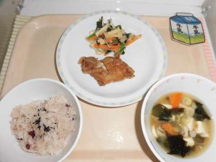 今日は今年度最後の給食です。卒業と進級をお祝いして、みんなでお赤飯を食べます。この1年で本当によく食べられるようになりました。これからも、たくさん食べて元気に過ごしましょう。