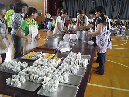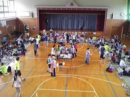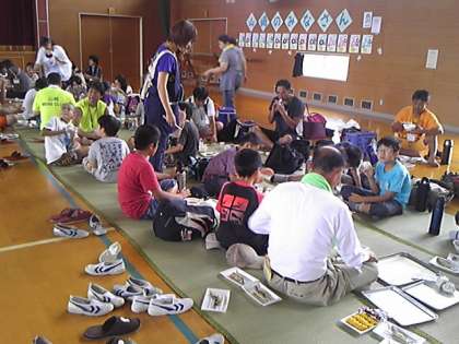 体育館で地区ごとに集まり、昼食会が始まりました。大きなおにぎり・芋汁・鮎の塩焼き・漬物を食べ、元気回復です。午後の川下りに備えます。