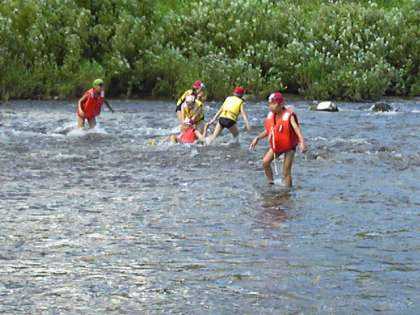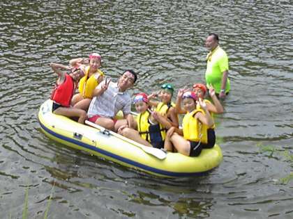 班ごとにボートに乗って川下りを楽しんでいます。各班二回ずつ乗ります。順番待ちの時には、川遊びを存分に楽しんでいます。