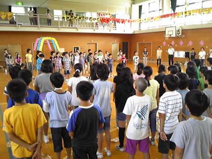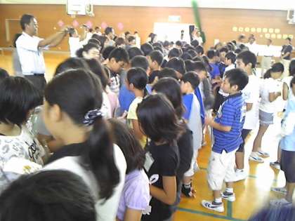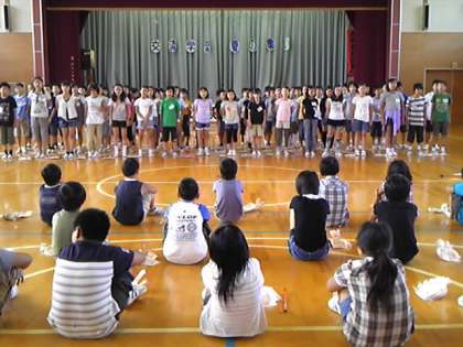 歓送会:お別れの会となりました。互いに代表の友達が3日間の感想を述べ、山崎小学校が合唱「ビリーブ」を紹介。続いての手作りのプレゼント交換では山崎小学校からは団扇を、長沢小学校からは、コースターを互いに送りました。最後に全員で「友達の歌」を合唱しました。