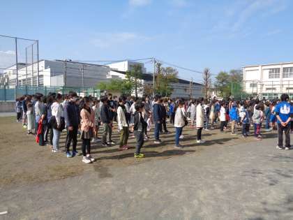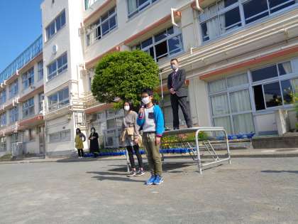 5年生の整列の仕方、話の聞き方、朝礼台から