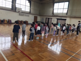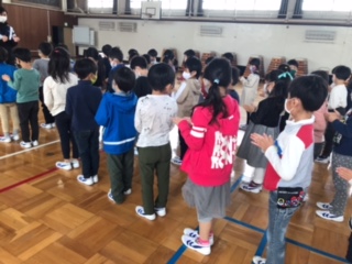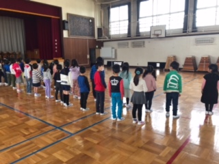 1組と2組合同で、一年生を迎える会の練習をしました。2〜6年生のお兄さんお姉さんに、かっこよく並ぶ姿を見せられるよう、並ぶ練習も頑張りました。