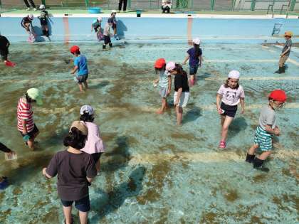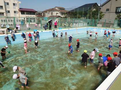 プール工事の前に、「プールの中にいる小さな生き物を救い出すぞ」と張り切る2年生