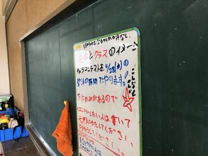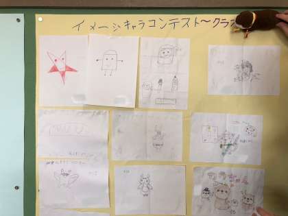 教室後方の掲示板にキャラクターの候補作品が貼り出されています。