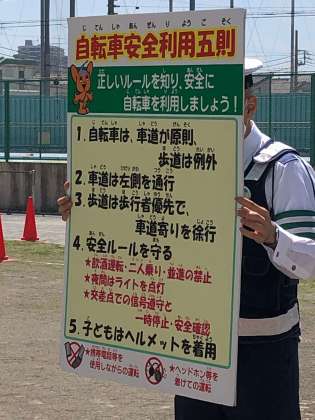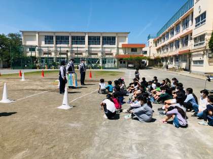 北沢警察署から3名の警察官に来ていただき、青空のもと交通安全教室をしていただきました。