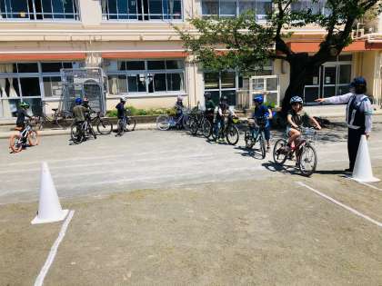 自転車の安全な乗り方について教えていただいた後、代表児童に実際自転車に乗ってもらい校庭で演習しました。