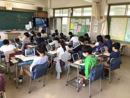 算数教室で少人数の先生がカメラに向かって授業を進めてくれて、それを1組・2組の教室でそれぞれのタブレットを使ってzoomで試聴しながら学習を進めました。