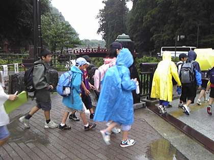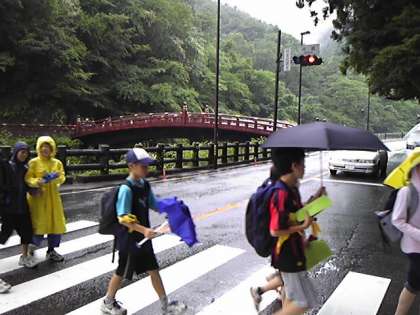 神橋でバスを降り、神橋を見学しながら東照宮へ向かっています。