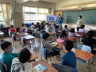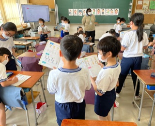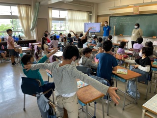 外国語活動の時間、ALTのジョアン先生とジェスチャーの仕方を学習しました。