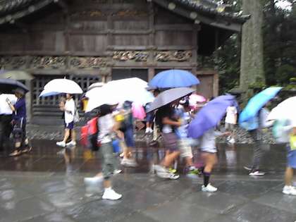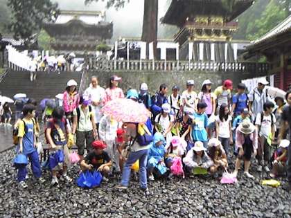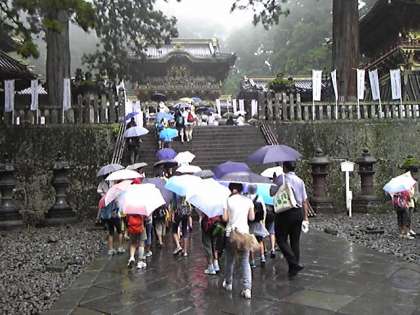 日光東照宮に入りました。残念ながら雨の中の見学です。傘を一瞬閉じて、集合写真の撮影もしました。行動班で見学中です。