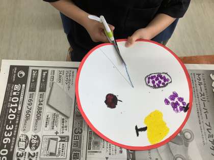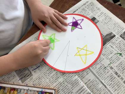 模様や絵、マークを描いてオリジナルの花笠にしました。