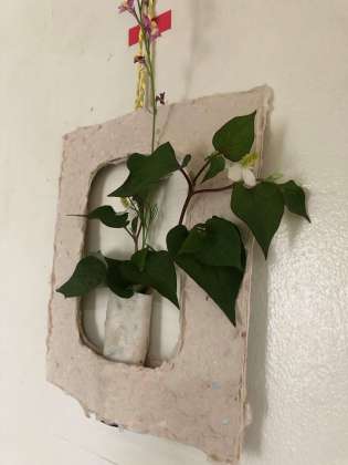 また運が良ければ掲示板付近には和紙の作品が飾られていることでしょう。今回は裏庭で見つけた雑草を、紙パックリサイクルの額縁で紹介してます。