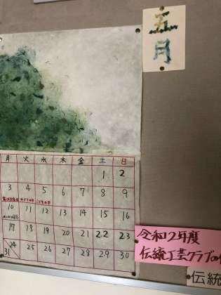 伝統工芸室のすぐ近くの掲示板に、今年度(来年の3月まで)、昨年度の伝統工芸クラブの児童が作成した和紙のカレンダーを展示します。