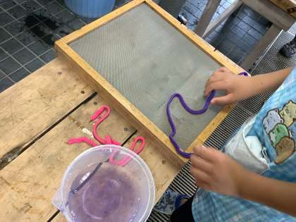 紐を巧みに使って、すき舟の中にいろいろな模様や形を作りました。