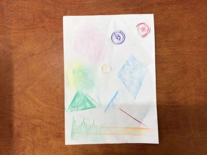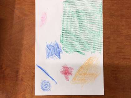 毛糸やネット、おもちゃのコインやリボンなどを紙の下に置き、上から色鉛筆でこすると…