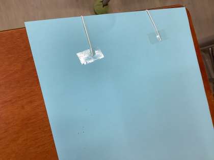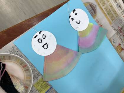 画用紙に糸をつけて前回作ったてるてる坊主をつけました。