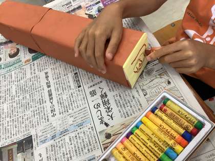 最後に、年輪や木の模様をクレパスで描きました。