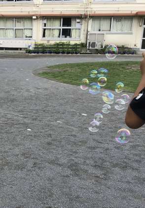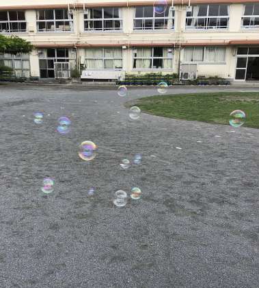 風になびいて、しゃぼん玉が飛んで、校庭の一角がきらきら光る幻想的な世界になりました。
