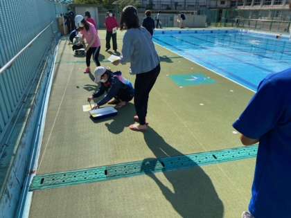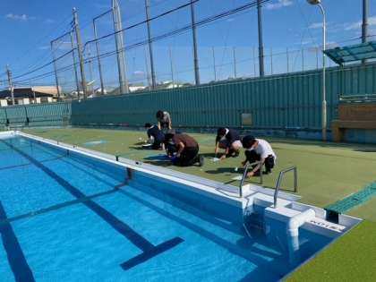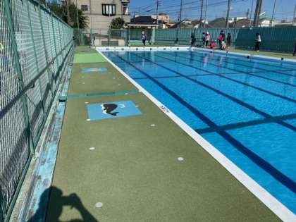 整列時や入水時、間隔を開けて水泳に取り組みます。