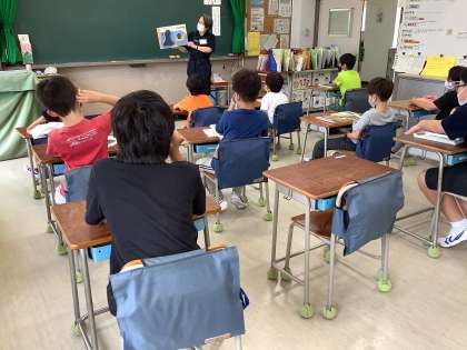 図書の時間に「たこのぼうやがついてきた」の読み聞かせをしてもらいました。