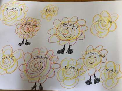 ふわふわ言葉をたくさん使うと、ふわふわフワッフィーがたくさん現れます。子どもたちは、紙いっぱいにフワッフィーを描きました。