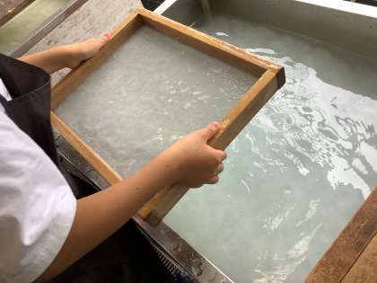 1枚は、漉いた紙に上から水を落とし、水玉模様を作る「落水」という技法をしました。