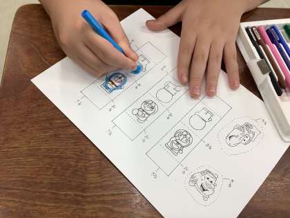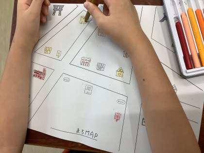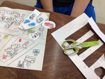 動かすおもちゃの紙や地図に色を塗ったり、切ったりしました。