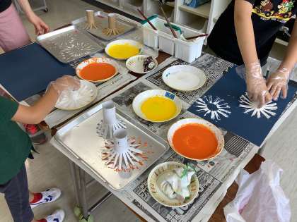 タコのような形のスタンプの型を使い、夏の風物詩の作品を作っています。
