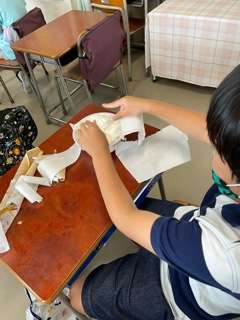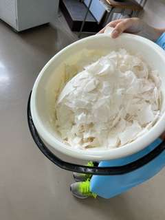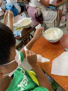 この小さくちぎった紙は、この後ミキサーにかけて、いよいよ紙の赤ちゃんの誕生です。