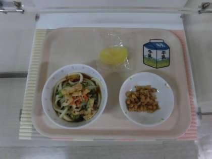 1学期の給食も残すところ、あと3日となりました。相変わらずじめじめしている今日は、のどごしの良いうどんの献立です。しっかりとよく噛み、よく食べて元気に過ごしましょう。