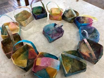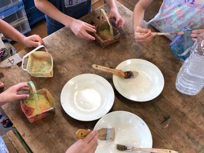 紙を漉いて、乾燥機で乾かして、折ることで小物入れに仕上げます。最後は丈夫にするために、あるものを塗りました。