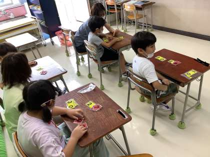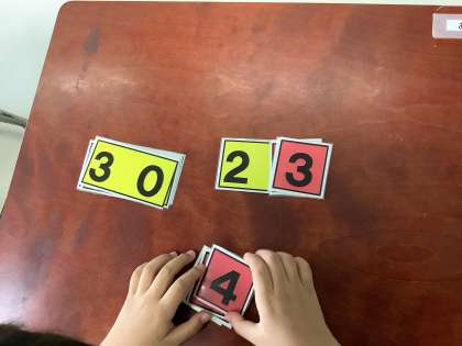 カードを使い、10の位の上に1の位の数を乗せながら数えました。