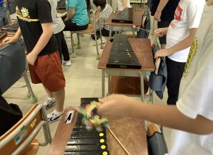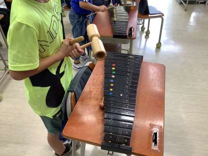 今回は、木琴に加え、「ウッドブロック」と「鈴」を使いました。