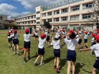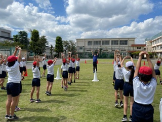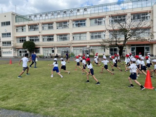 スキップや、体を前に速く進めるための足の出し方の練習をしています。