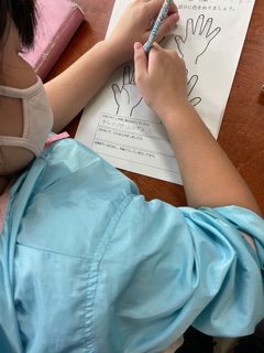 今日は、ブラックライトに当てると光る特殊な液を手に塗って、それを汚れに見立て、手洗いでどれだけ落とせるか実験してみました。