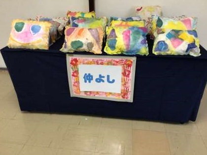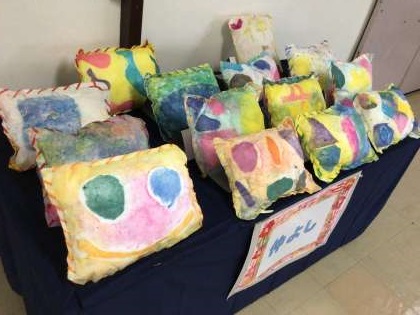 1学期に制作した和紙のクッションを体育館の前に展示しました。