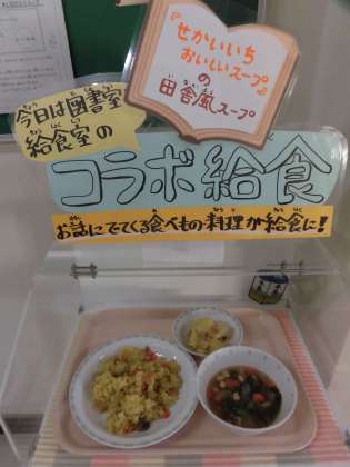 今日は図書旬間第3弾です。「せかいいち おいしいスープ」という本から、給食では「田舎風スープ」をみんなで食べます。
