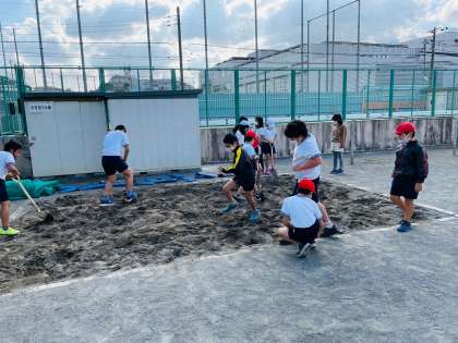 プール近くの砂場で、怪我防止の準備のためにスコップで土を柔らかくしています!