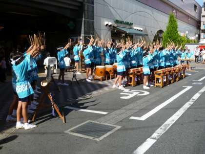 9月17日(土)、日頃からお世話になっている梅丘商店街のお祭りで、6年生が「山崎太鼓」の演奏を披露しました。残暑の厳しい中でしたが、練習の成果を発揮し力強い演奏を大勢の皆さんに聴いていただきました。学校の外での演奏が初めての20代目。緊張していた表情もしだいに和らぎ、汗をかきながら最後まで演奏を頑張りました。