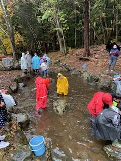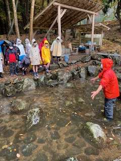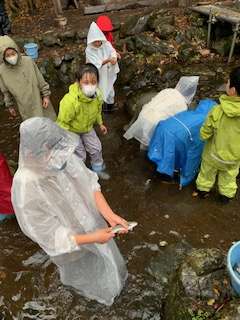 小雨になったので、カッパ着てマス掴みにチャレンジ!