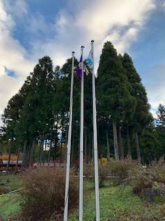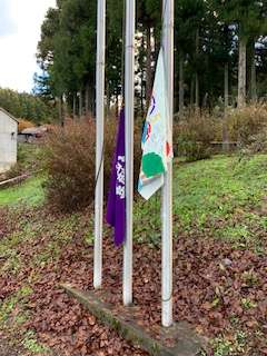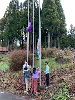 昨日出来なかった校旗とみんなが寄せ書きした旗をあげました。