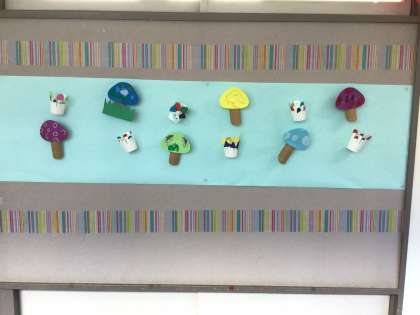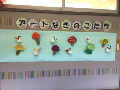 今日の図工では、秋の味覚「きのこ」を作りました。かわいいきのこが勢揃い。教室前の廊下を賑やかにしてくれました。