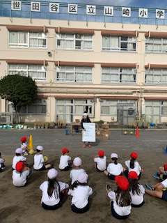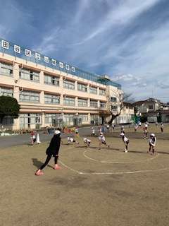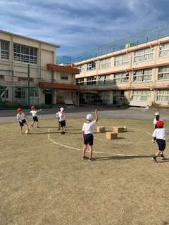 校庭で1-2のみんながボール蹴りゲームをしています。