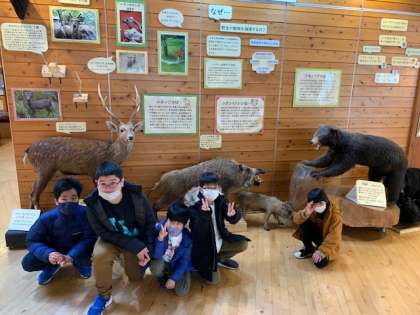 クマ、イノシシ、シカの剥製と記念撮影。触ってみたら思っていたよりふわふわな毛並みでしたよ。