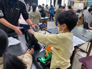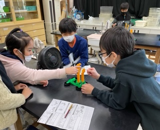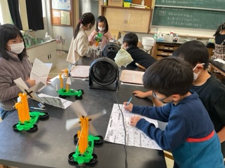 小型扇風機を回して、風を起こしてグループで協力し合って実験しています。