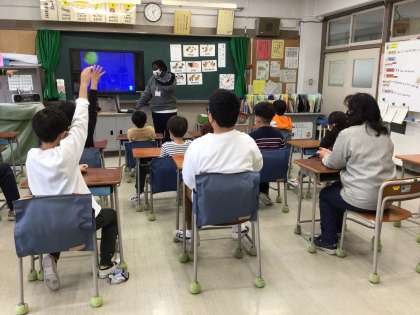今日の外国語活動では、動物の単語を学習しました。鳴き声と動物を組み合わせて、楽しみながら単語を覚えていきました。